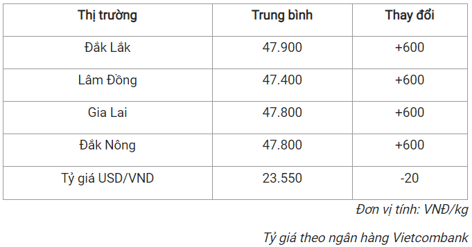 Tương tự, giá cà phê tại tỉnh Đắk Lắk cũng tăng lên mức 47.900 đồng/kg trong hôm nay.