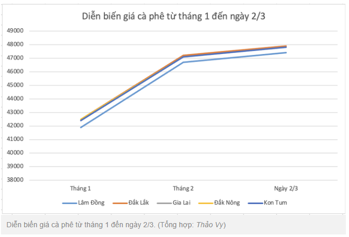 Giá cà phê hôm nay (2/3) duy trì đà tăng tại thị trường nội địa. So với hôm qua, giá thu mua trong nước tăng 600 đồng/kg lên khoảng 47.400 - 47.900 đồng/kg.