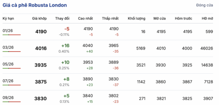 Kết thúc phiên giao dịch gần nhất, giá cà phê Robusta tại London biến động trái chiều trong các kỳ giao hàng. Cụ thể, kỳ giao tháng 1/2026 giảm nhẹ 5 USD/tấn, xuống mức 4190 USD/tấn. Trong khi đó, hợp đồng giao kỳ hạn tháng 9/2026 lại tăng thêm 5 USD/tấn, đạt mức 3830 USD/tấn.