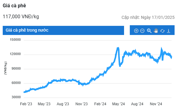 Theo ghi nhận, giá cà phê tại khu vực Tây Nguyên hôm 19/1 tiếp tục tăng 500 – 1.000 đồng/kg so với ngày hôm trước, lên mức 119.300 – 120.000 đồng/kg. Đây cũng là ngày tăng giá thứ tư liên tiếp trên thị trường nội địa.