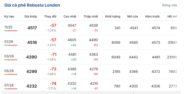 Trong phiên giao dịch ngày 19/11, giá cà phê trực tuyến robusta hợp đồng giao kỳ hạn tháng 11/2025 trên sàn London quay đầu giảm 1,24% (57 USD/tấn) so với phiên giao dịch trước, xuống còn 4.517 USD/tấn. Hợp đồng giao kỳ hạn tháng 1/2026 giảm 1,24% (57 USD/tấn), đạt 4.516 USD/tấn.