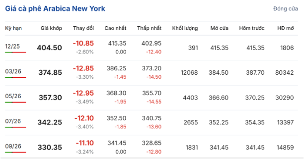 Trên sàn giao dịch New York, giá cà phê arabica giao kỳ hạn tháng 12/2025 cũng giảm 2,6% (10,85 US cent/pound) so với ngày hôm trước, đạt 404,5 US cent/pound. Hợp đồng giao tháng 3/2026 giảm 3,3% (12,85 US cent/pound), còn 374,85 US cent/pound.