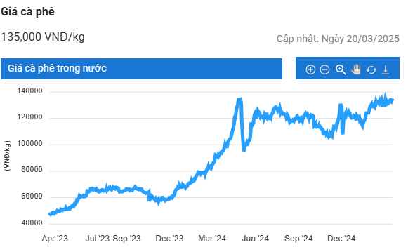 Giá cà phê hôm nay (20/3) cùng tăng trên cả hai sàn giao dịch, với robusta thêm 58 USD/tấn lên 5.527 USD/tấn và arabica tăng 7,2 US cent/pound. Đáng chú ý, giá cà phê nội địa Việt Nam đã lần thứ hai kể từ đầu năm leo lên mức kỷ lục 135.000 đồng/kg.