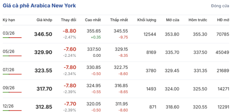 Trên sàn giao dịch New York, giá cà phê arabica giao kỳ hạn tháng 03/2026 tiếp tục giảm mạnh 2,47% (8,8 US cent/pound), xuống còn 346,5 US cent/pound. Hợp đồng giao tháng 5/2026 giảm 2,24% (7,6 US cent/pound), đạt 329,9 US cent/pound.