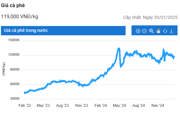Giá cà phê robusta hôm nay (21/1) bật tăng mạnh 137 USD/tấn lên mức 5.143 USD/tấn. Tương tự, giá cà phê nội địa Việt Nam cũng tăng 1.000 - 1.500 đồng/kg lên mức 119.300 - 120.500 đồng/kg, khi thị trường chuẩn bị bước vào kỳ nghỉ Tết Nguyên đán.