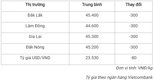 Tương tự, giá cà phê tại tỉnh Đắk Lắk cũng giảm về mức 45.400 đồng/kg trong hôm nay.