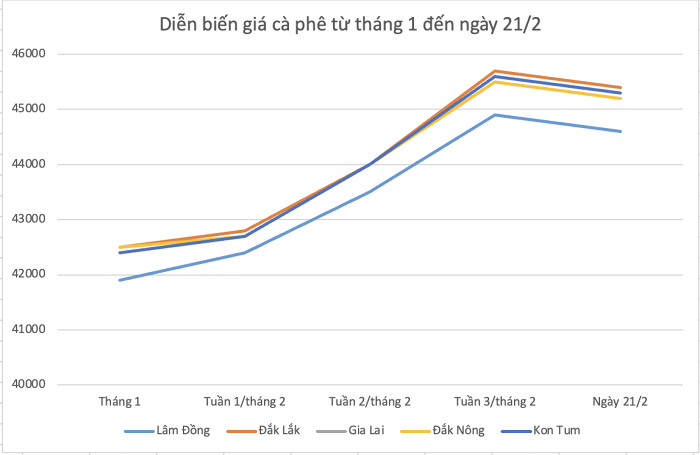 Giá cà phê hôm nay (21/2) giảm trở lại sau chuỗi tăng trong tuần trước. So với hôm qua, giá thu mua tại thị trường nội địa giảm 300 đồng/kg, hiện dao động trong khoảng 44.600 - 45.400 đồng/kg.