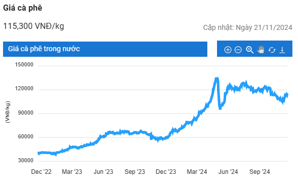 Trên sàn giao dịch London, kết thúc phiên giao dịch ngày 22/11, giá cà phê trực tuyến robusta hợp đồng giao tháng 1/2025 giảm nhẹ 0,23% (11 USD/tấn) so với phiên giao dịch trước, xuống còn 4.787 USD/tấn. Tương tự, hợp đồng giao tháng 3/2025 cũng giảm 0,21% (10 USD/tấn), đạt 4.732 USD/tấn.