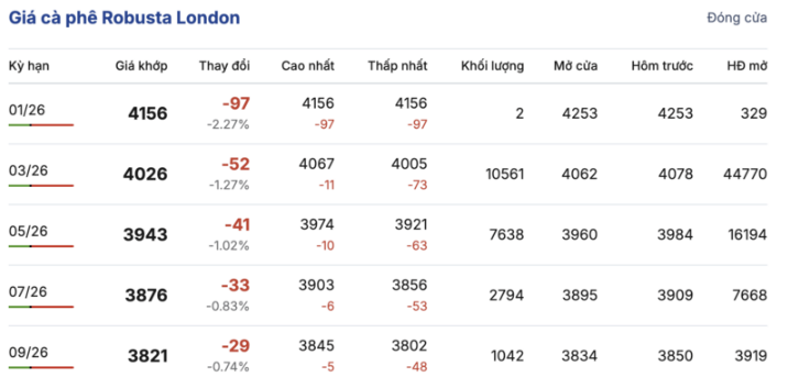 Kết thúc phiên giao dịch gần nhất, giá cà phê Robusta tại London ghi nhận phiên giảm giá liên tục trong các kỳ giao hàng. Cụ thể, kỳ giao tháng 1/2026 giảm mạnh 97 USD/tấn, xuống mức 4156 USD/tấn. Trong khi đó, hợp đồng giao kỳ hạn tháng 9/2026 tiếp tục giảm 29 USD/tấn, đạt mức 3821 USD/tấn.