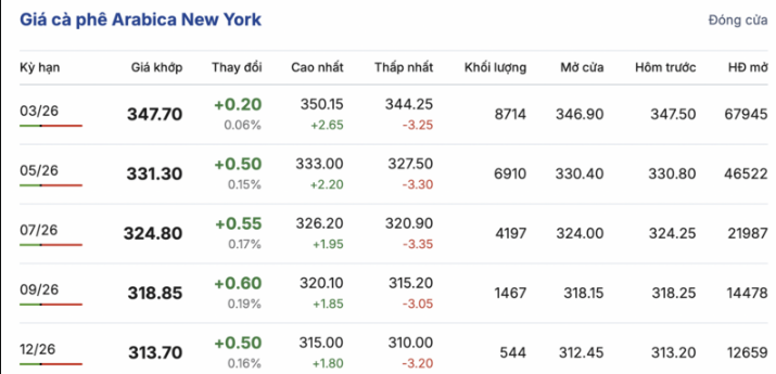Trong khi đó, trên sàn New York, giá cà phê Arabica lại ghi nhận phục hồi trong các kỳ giao hàng. Cụ thể, kỳ giao tháng 3/2026 đảo chiều tăng nhẹ 0,2 cent/lb, đạt mức 347,7 cent/lb. Tương tự, hợp đồng giao tháng 12/2026 cũng tăng nhẹ 0,5 cent/lb, đạt mức 313,7 cent/lb.