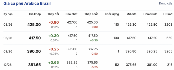 Kết thúc phiên giao dịch gần nhất, cà phê Arabica Brazil ghi nhận biến động trái chiều trong các kỳ giao hàng. Cụ thể: kỳ hạn tháng 3/2026 đạt mức 425,0 cent/lb, giảm nhẹ 0,8 cent/lb so với hôm qua. Kỳ giao hàng tháng 12/2026 đảo chiều tăng nhẹ 0,65 cent/lb, lên mức 381,65 cent/lb.