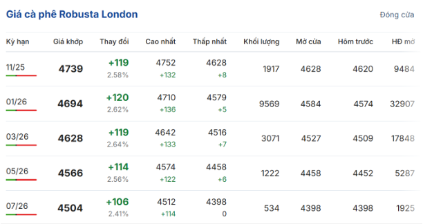 Kết thúc phiên giao dịch ngày 23/10, giá cà phê trực tuyến robusta hợp đồng giao kỳ hạn tháng 11/2025 trên sàn London tiếp tục tăng mạnh 2,58% (119 USD/tấn) so với phiên giao dịch trước, lên mức 4.739 USD/tấn. Hợp đồng giao kỳ hạn tháng 1/2026 tăng 2,62% (120 USD/tấn), đạt 4.694 USD/tấn.