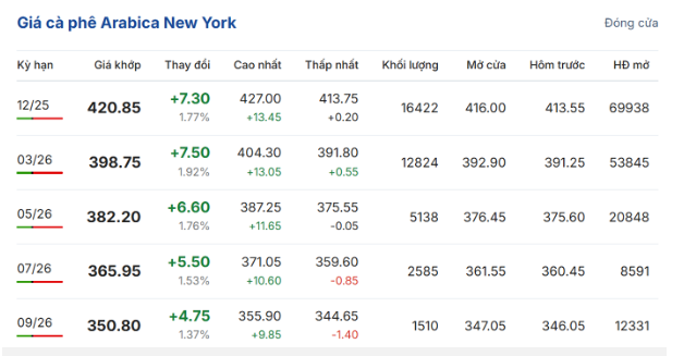 Trên sàn giao dịch New York, giá cà phê arabica giao kỳ hạn tháng 12/2025 tăng ngày thứ tư liên tiếp, với mức tăng 1,77% (7,3 US cent/pound) so với phiên trước, lên mức 420,85 US cent/pound. Hợp đồng giao tháng 3/2026 tăng 1,92% (7,5 US cent/pound), đạt 398,75 US cent/pound.
