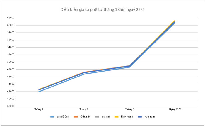 Giá cà phê hôm nay (23/5) tại thị trường trong nước tăng cao nhất 1.000 đồng/kg. Hiện, tỉnh Đắk Nông ghi nhận mức giao dịch cao nhất trong các địa phương với 61.300 đồng/kg.