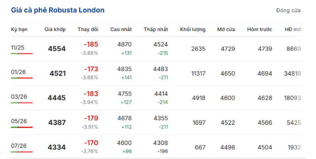 Đóng cửa phiên giao dịch ngày 23/10, giá cà phê trực tuyến robusta hợp đồng giao kỳ hạn tháng 11/2025 trên sàn London quay đầu giảm mạnh 3,89% (185 USD/tấn) so với phiên giao dịch trước, xuống còn 4.554 USD/tấn. Hợp đồng giao kỳ hạn tháng 1/2026 giảm 3,68% (173 USD/tấn), đạt 4.521 USD/tấn.