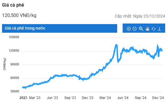Giá cà phê hôm nay (24/12) cùng tăng trở lại trên cả hai sàn giao dịch, với robusta tăng hơn 100 USD/tấn và arabica tăng 2,25 US cent/pound. Còn tại thị trường nội địa Việt Nam, giá cà phê đang dao động trong khoảng 120.200 – 121.000 đồng/kg, tăng nhẹ 200 – 400 đồng/kg so với hôm qua.