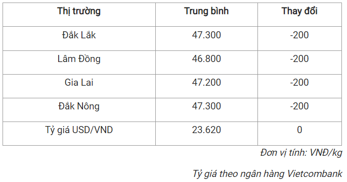 Tương tự, giá cà phê tại hai tỉnh Đắk Lắk và Đắk Nông cũng giảm về mức 47.300 đồng/kg trong hôm nay.