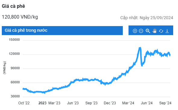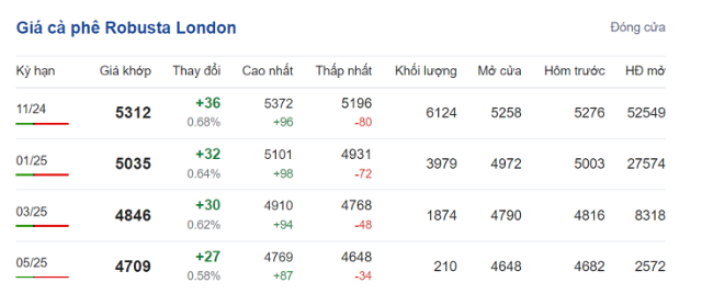 Tính đến sáng ngày 25/9, giá cà phê robusta hợp đồng giao tháng 11 trên sàn London tiếp tục tăng 0,7% (36 USD/tấn) so với phiên giao dịch trước, lên mức 5.312 USD/tấn; hợp đồng giao tháng 1/2025 cũng tăng 32 USD/tấn, đạt 5.035 USD/tấn.