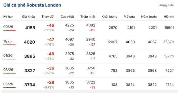 Trên sàn giao dịch London, giá cà phê trực tuyến robusta hợp đồng giao kỳ hạn tháng 9/2025 đóng cửa phiên giao dịch ngày 18/8 ở mức 4.155 USD/tấn, quay đầu giảm 1,09% (46 USD/tấn) so với cuối tuần trước. Hợp đồng giao kỳ hạn tháng 11/2025 giảm 1,16% (47 USD/tấn), đạt 4.020 USD/tấn.