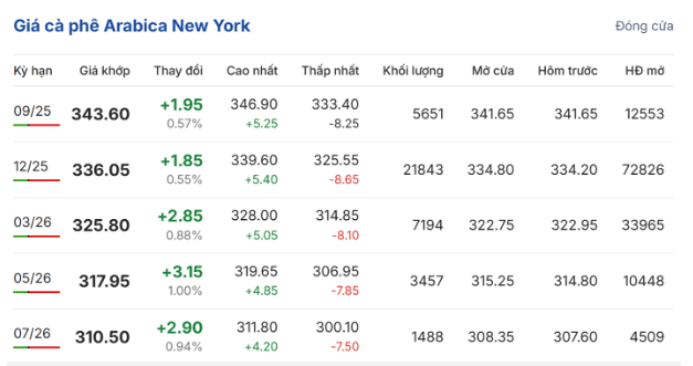 Ngược lại, tại sàn giao dịch New York, giá cà phê arabica giao kỳ hạn tháng 9/2025 tiếp tục tăng 0,57% (1,95 US cent/pound), lên mức 343,6 US cent/pound. Hợp đồng giao kỳ hạn tháng 12/2025 tăng 0,55% (1,85 US cent/pound), đạt 336,05 US cent/pound.
