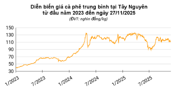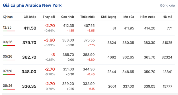 Trên sàn giao dịch New York, giá cà phê arabica giao kỳ hạn tháng 12/2025 cũng giảm nhẹ 0,64% (2,7 US cent/pound), xuống còn 411,5 US cent/pound. Hợp đồng giao tháng 3/2026 giảm 0,93% (3,6 US cent/pound), đạt 379,7 US cent/pound.