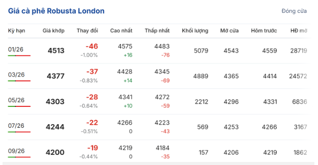 Kết thúc phiên giao dịch ngày 26/11, giá cà phê trực tuyến robusta hợp đồng giao kỳ hạn tháng 1/2026 trên sàn London đạt 4.513 USD/tấn, giảm 1% (46 USD/tấn) so với phiên giao dịch trước. Hợp đồng giao kỳ hạn tháng 3/2026 giảm 0,83% (37 USD/tấn), đạt 4.377 USD/tấn.