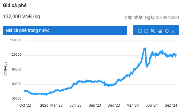 Kết thúc phiên giao dịch ngày 27/9, giá cà phê robusta hợp đồng giao tháng 11 trên sàn London tiếp tục tăng 1,5% (81 USD/tấn) so với phiên giao dịch trước, lên mức kỷ lục mới là 5.527 USD/tấn; hợp đồng giao tháng 1/2025 tăng 90 USD/tấn, lên 5.242 USD/tấn.
