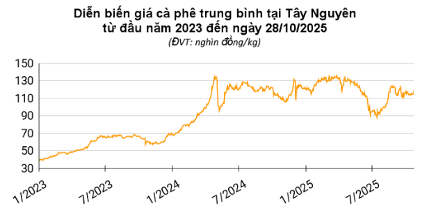 Khảo sát lúc 11h00 sáng ngày 28/10, giá cà phê nhân xô tại khu vực Tây Nguyên dao động trong khoảng 114.500 – 115.700 đồng/kg, giảm 1.200 – 1.500 đồng/kg so với ngày hôm qua.