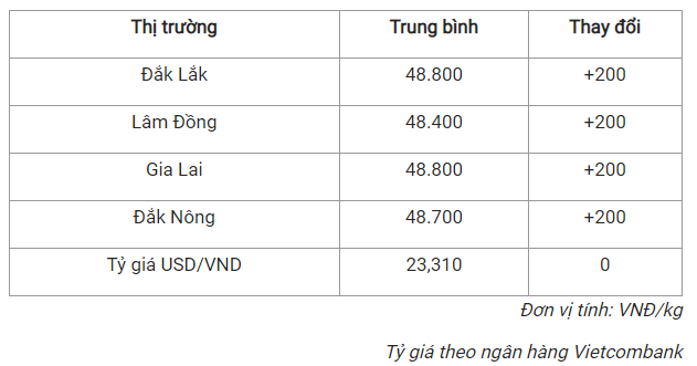 Trong đó, tỉnh Lâm Đồng có mức giá thấp nhất là 48.400 đồng/kg. Kế đến là Đắk Nông với 48.700 đồng/kg.
