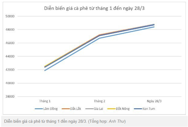 Giá cà phê hôm nay (28/3) tại thị trường trong nước tăng tiếp 200 đồng/kg. Trong đó, 48.800 đồng/kg là mức giao dịch cao nhất trong các địa phương được khảo sát.