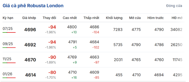 Trong phiên giao dịch kết thúc vào sáng ngày 28/5, giá cà phê trực tuyến robusta hợp đồng giao tháng 7/2025 trên Sàn giao dịch London đóng cửa ở mức 4.696 USD/tấn, giảm 1,96% (94 USD/tấn) so với phiên giao dịch trước; hợp đồng giao kỳ hạn tháng 9 cũng giảm 1,96% (94 USD/tấn), xuống còn 4.692 USD/tấn.