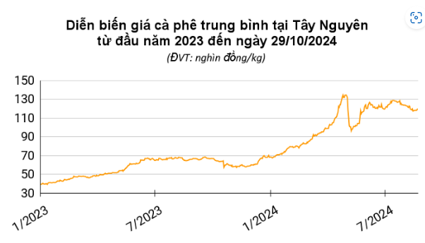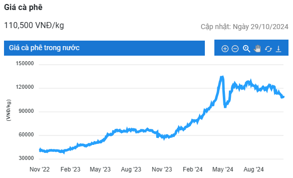 Giá cà phê hôm nay (29/10) tăng 91 USD/tấn đối với robusta và gần 4 US cent/pound với arabica. Tại trong nước, giá tăng 1.500 - 1.600 đồng/kg lên mức 110.000 - 110.700 đồng/kg. Hoàn lưu sau bão có thể gây mưa nhiều tại vùng trồng cà phê trọng điểm Tây Nguyên của Việt Nam, làm chậm tiến độ thu hoạch niên vụ mới.