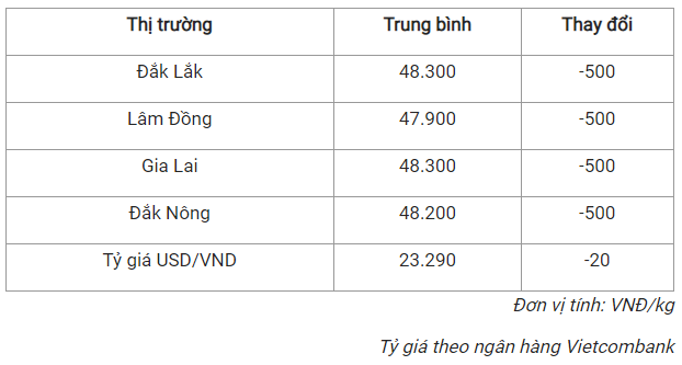 Ghi nhận cho thấy, các địa phương đang thu mua cà phê với giá trong khoảng 47.900 - 48.300 đồng/kg.
