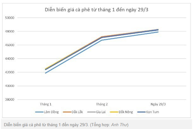 Giá cà phê hôm nay (29/3) tại thị trường trong nước giảm 500 đồng/kg. Trong đó, 47.900 đồng/kg là mức giao dịch thấp nhất trong các địa phương được khảo sát, được ghi nhận tại tỉnh Lâm Đồng.