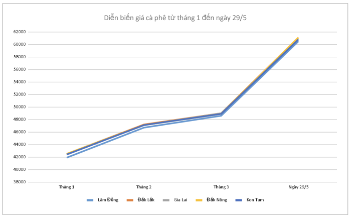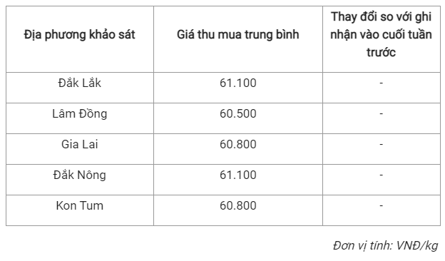 Cùng thời điểm khảo sát, hai tỉnh Đắk Lắk và Đắk Nông ghi nhận mức giao dịch là 61.100 đồng/kg. Đây là giá thu mua cao nhất trong các địa phương được khảo sát.