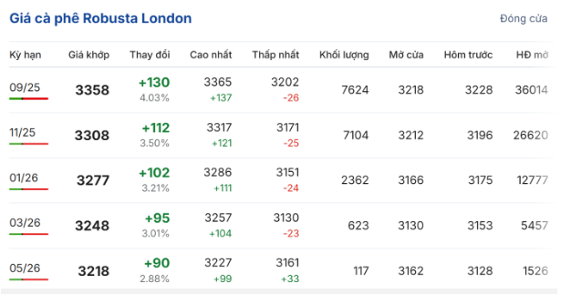 Trên sàn giao dịch London, giá cà phê trực tuyến robusta hợp đồng giao kỳ hạn tháng 9/2025 đóng cửa phiên giao dịch mới nhất ở mức 3.358 USD/tấn, tăng mạnh 4,03% (130 USD/tấn) so với mức thấp nhất 16 tháng ghi nhận vào cuối tuần trước. Hợp đồng giao kỳ hạn tháng 11/2025 tăng 3,5% (112 USD/tấn), đạt 3.308 USD/tấn.