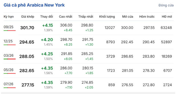 Tại sàn giao dịch New York, giá cà phê arabica giao kỳ hạn tháng 9/2025 cũng tăng 1,39% (4,15 US cent/pound), lên mức 301,7 US cent/pound. Hợp đồng giao kỳ hạn tháng 11/2025 tăng 1,45% (4,2 US cent/pound), lên 294,65 US cent/pound.
