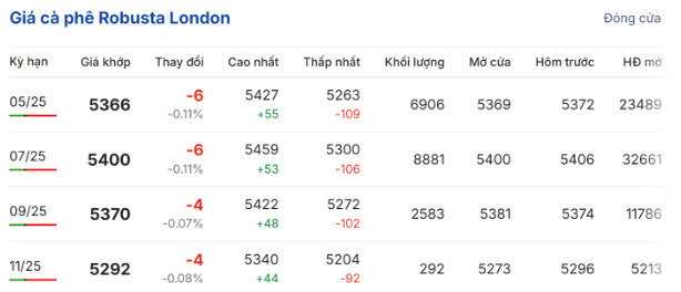 Trên Sàn giao dịch London, giá cà phê trực tuyến robusta hợp đồng giao tháng 5/2025 đóng cửa phiên giao dịch ngày 3/4 ở mức 5.366 USD/tấn, giảm nhẹ 0,11% (6 USD/tấn) so với phiên giao dịch trước; hợp đồng giao tháng 7/2025 giảm 0,11% (6 USD/tấn), xuống còn 5.400 USD/tấn.