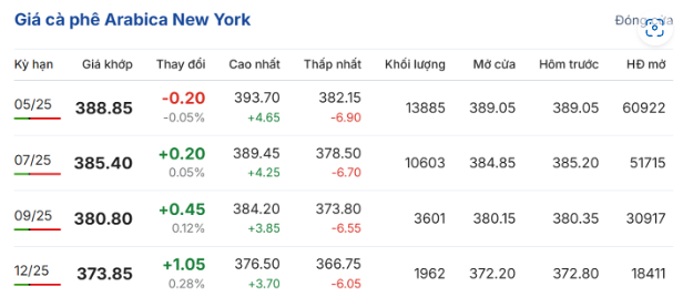 Trên Sàn giao dịch New York, giá cà phê arabica giao tháng 5/2025 giảm 0,05% (0,2 US cent/pound), ở mức 388,85 US cent/pound; trong khi hợp đồng giao kỳ hạn tháng 7/2025 tăng 0,05% (0,2 US cent/pound), lên mức 385,4 US cent/pound.