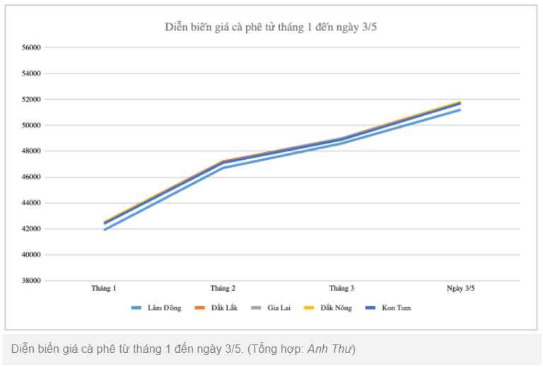 Giá cà phê hôm nay (3/5) tại thị trường trong nước tăng 300 đồng/kg. Theo đó, mức giao dịch thấp nhất trong các địa phương được khảo sát là 51.200 đồng/kg, được ghi nhận tại tỉnh Lâm Đồng.