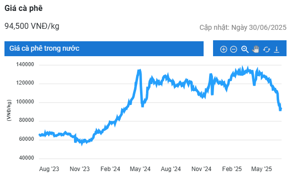 Tại Gia Lai, cà phê hiện được giao dịch ở mức 94.500 đồng/kg, tăng 100 đồng/kg. Trong khi đó, Lâm Đồng cũng tăng 100 đồng/kg, lên mức 94.300 đồng/kg.