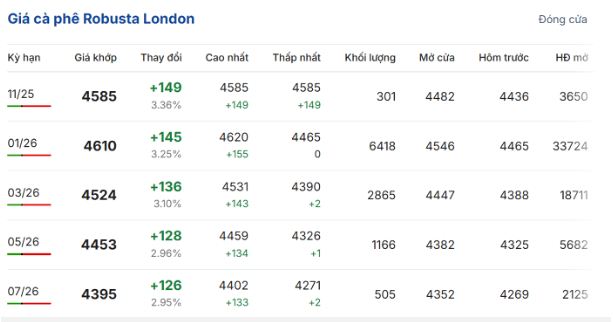 Trong phiên giao dịch ngày 29/10, giá cà phê trực tuyến robusta hợp đồng giao kỳ hạn tháng 11/2025 trên sàn London tăng mạnh 3,36% (149 USD/tấn) so với phiên giao dịch trước, lên mức 4.585 USD/tấn. Hợp đồng giao kỳ hạn tháng 1/2026 tăng 3,25% (145 USD/tấn), đạt 4.610 USD/tấn.