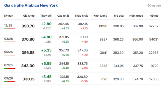 Trên sàn giao dịch New York, giá cà phê arabica giao kỳ hạn tháng 12/2025 tăng 0,27% (2,8 US cent/pound) so với ngày hôm trước, đạt 390,7 US cent/pound. Hợp đồng giao tháng 3/2026 tăng 1,31% (4,8 US cent/pound), đạt 370,8 US cent/pound.