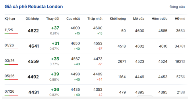 Trong phiên giao dịch ngày 30/10, giá cà phê trực tuyến robusta hợp đồng giao kỳ hạn tháng 11/2025 trên sàn London tiếp tục tăng 0,81% (37 USD/tấn) so với phiên giao dịch trước, lên mức 4.622 USD/tấn. Hợp đồng giao kỳ hạn tháng 1/2026 tăng 0,67% (31 USD/tấn), đạt 4.641 USD/tấn.