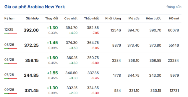 Trên sàn giao dịch New York, giá cà phê arabica giao kỳ hạn tháng 12/2025 tăng 0,33% (1,3 US cent/pound) so với ngày hôm trước, đạt 392 US cent/pound. Hợp đồng giao tháng 3/2026 tăng 0,39% (1,45 US cent/pound), đạt 372,25 US cent/pound.