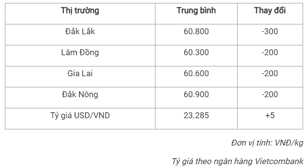 Cụ thể, tỉnh Lâm Đồng có mức giá thấp nhất là 60.300 đồng/kg, giảm 200 đồng/kg. Kế đến là tỉnh Gia Lai với giá 60.600 đồng/kg sau khi giảm 200 đồng/kg.