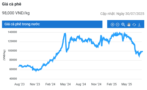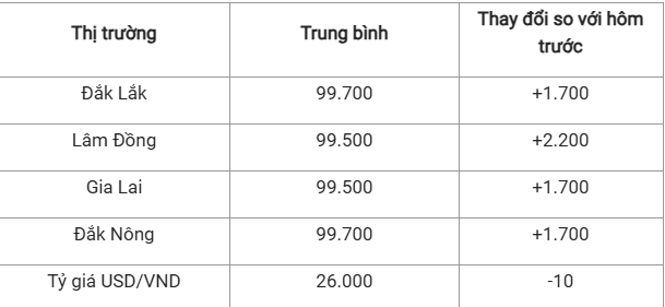 Cụ thể, tại Đắk Lắk và Đắk Nông, giá cà phê cùng tăng 1.700 đồng/kg, lên mức 99.700 đồng/kg.