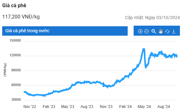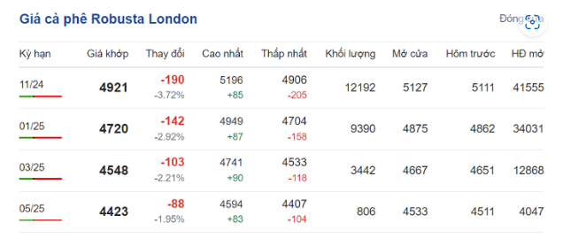 Kết thúc phiên giao dịch ngày 4/10, giá cà phê robusta hợp đồng giao tháng 11 giảm tiếp tục giảm 3,7% (tương ứng 190 USD/tấn) so với phiên giao dịch trước, xuống còn 4.921 USD/tấn. Hợp đồng giao tháng 1/2025 cũng giảm 142 USD/tấn, chỉ còn 4.720 USD/tấn.