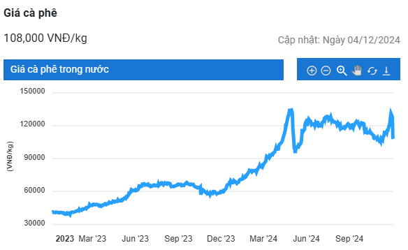 Giá cà phê robusta thế giới tiếp tục giảm mạnh 4,3% trong ngày 4/12. Ở trong nước, giá dao động từ 107.000 - 108.500 đồng/kg, giảm tổng cộng 22.000 – 22.500 đồng/kg chỉ sau ba ngày đầu tuần. Đã có làn sóng bán ra tại Việt Nam ngay sau khi xuất hiện dấu hiệu đầu tiên cho thấy giá đi xuống trên sàn giao dịch kỳ hạn ICE.
