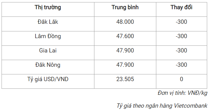 Tương tự, giá cà phê tại tỉnh Đắk Lắk cũng giảm xuống mức 48.000 đồng/kg trong hôm nay.